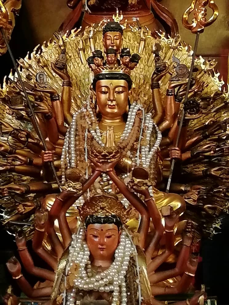 手上各有眼睛, 分别执各种法器, 这就是千手观音的神圣法像.